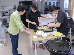 職員が、たこ焼きを焼いているのを見て、入居者様も手伝いに来て下さいました。