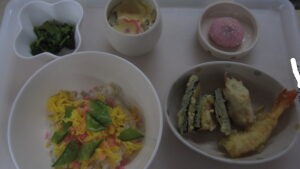 この日の昼食は、ちらし寿司、茶碗蒸し、天ぷら、お浸し、桜餅です。