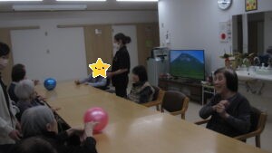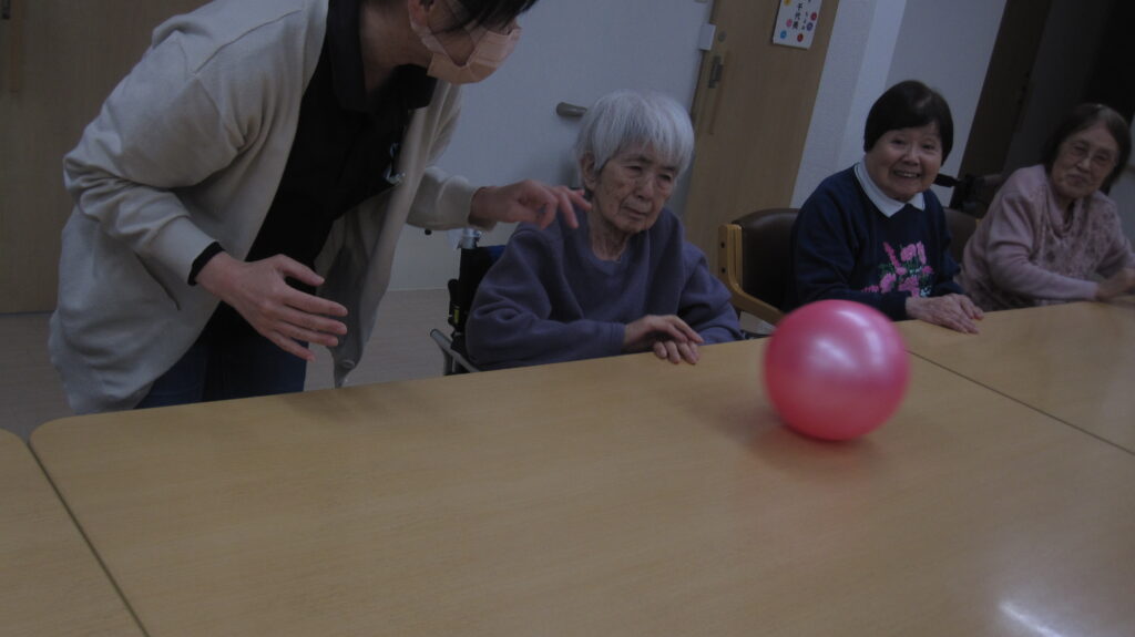 午後のレクでは、二つのボールをテーブルから落とさないように転がすゲームをしました。